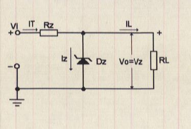 Circuito classico di riduttore di tensione stabilizzata a diodo zener. La tensione Vi può derivare da una batteria o da una qualsiasi sorgente di tensione continua