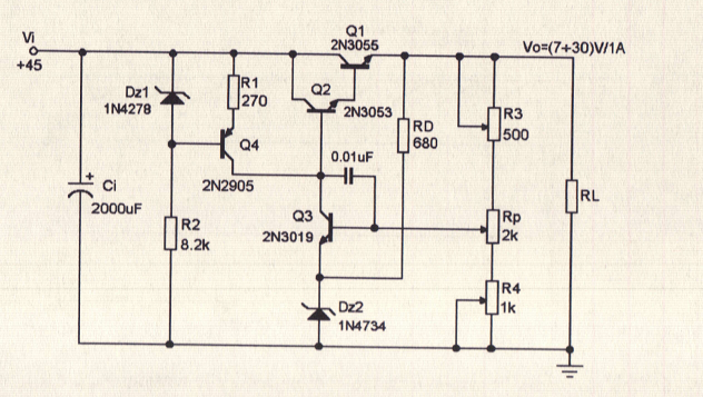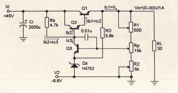 Stabilizzatore di tensione di cui all’esempio con tensione Vo di uscita variabile da 0 V a 30 V per Ia corrcnte di 1 A. ll condensatore da 0,01 pF evita l’insorgere di oscillazioni. Q3 si può usare BJT BC109 Q1 BJT ECG2586 Q2 BJT 2n1893