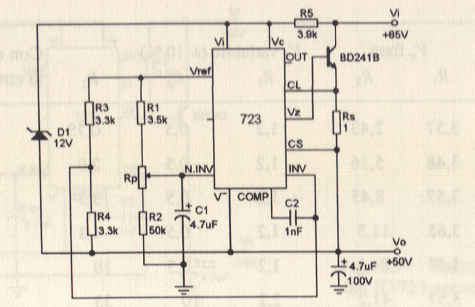 II diodo zener D1 avente Vz = I2 V consente di usare l’IC 723 per stabilizzare tensioni maggiori di 40 V. In questa configurazione si ha Vo = 50 V, Ilmax = 650 mA.