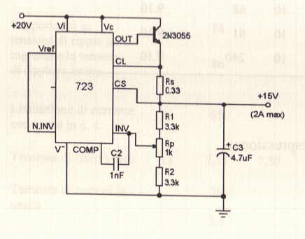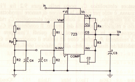 Secondo lo schema classico del regolatore, fra i pin 4 (Vref) e massa, è disposto un partitore di tensione realizzato dalle resistenze R2, R3 e R4, portando cosiall’ingresso non-invertente (pin 3) l’estremo comune appunto, alla R3, alla R4 e all’elettrolitico C7.