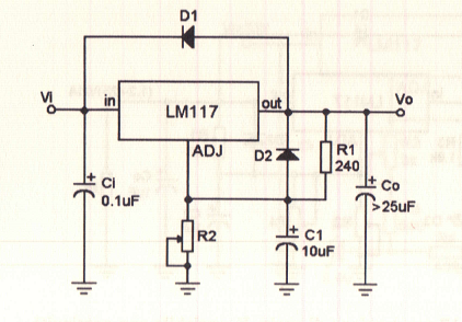La figura riporta quindi la configurazione di base dell’LM117 che, come
